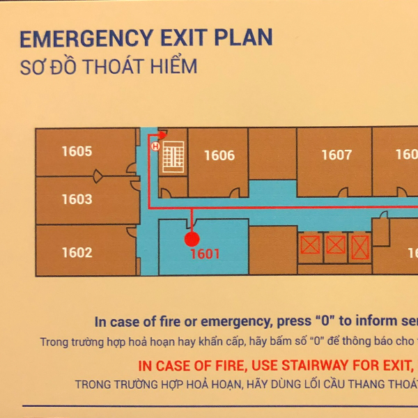 Bảng sơ đồ thoát hiểm dùng trong các nhà hàng, khách sạn, resort,.... dùng để xác định vị trí cá nhấn và hướng thoát hiểm gần nhất.